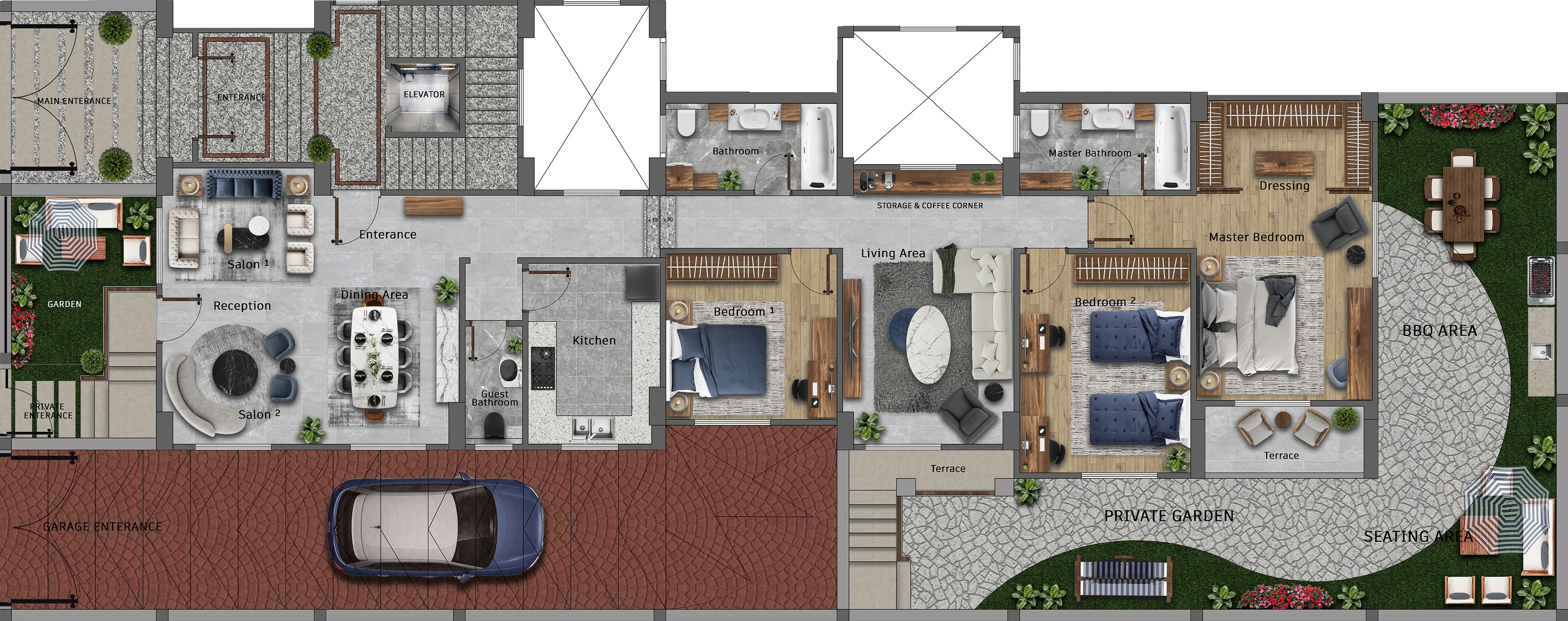 الحديقة الخلفية: ١١,١٣ * ٢,٧٥ م + ١٠,٦٣ * ٤,٠٠ م